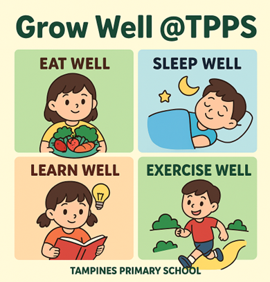 Grow Well @ TPPS is aligned with Singapore’s national health promotion strategy – the Grow Well SG to nurture healthy and balanced students through the 4 Wells – Eat Well, Sleep Well, Exercise Well, and Learn Well. Through the Healthy Log on the Singapore Student Learning Space (SLS), students build ownership of their well-being and develop positive lifestyle habits in a fun, student-friendly way, with the involvement of family and friends to strengthen community support.